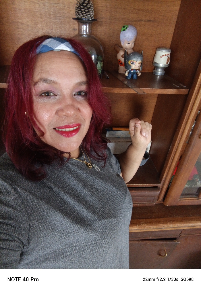 A selfie captures a smiling woman with red hair and a patterned headband. She wears a gray top and gold necklaces. Behind her is a wooden cabinet with shelves containing various items, including a glass bottle topped with a pinecone, figurines of cartoon characters, and a container labeled "Argen." The photo's lower edge displays camera settings: "NOTE 40 Pro" and "22mm f/2.2 1/30s ISO598."