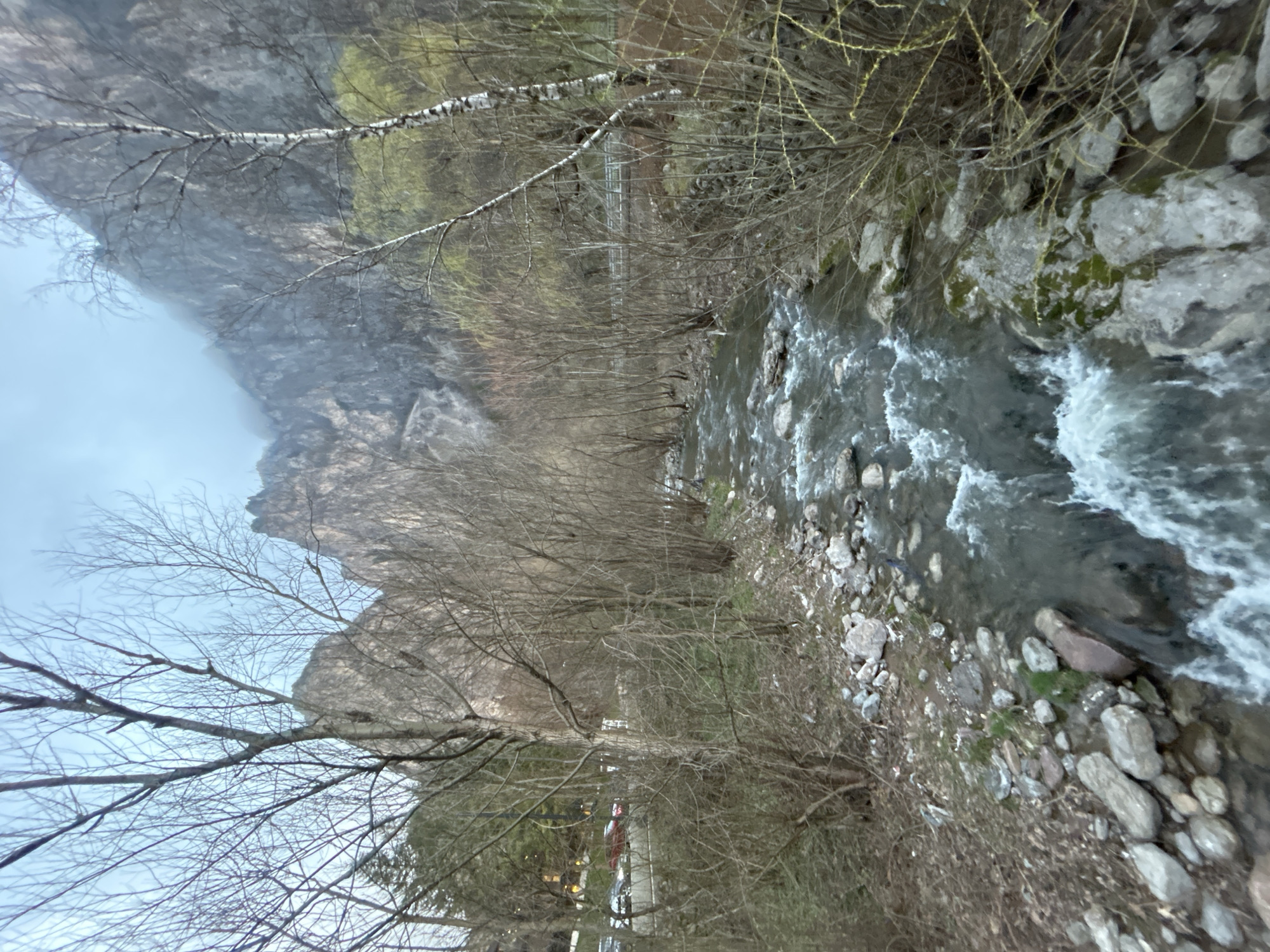 The image depicts a landscape featuring a river or stream flowing through a wooded area. A steep, rocky cliff rises on the left side of the frame, partially obscured by mist or clouds. The river has a rocky bank on the right side of the frame. Bare trees line both sides of the river. A bridge or elevated walkway is visible in the background. Based on the location, this could be the Leva River near Vratsa, Bulgaria, given the mountainous terrain and river features typical of that region. There are no people visible in the image. The overall environment appears natural and rugged, with elements of both forest and mountain terrain.