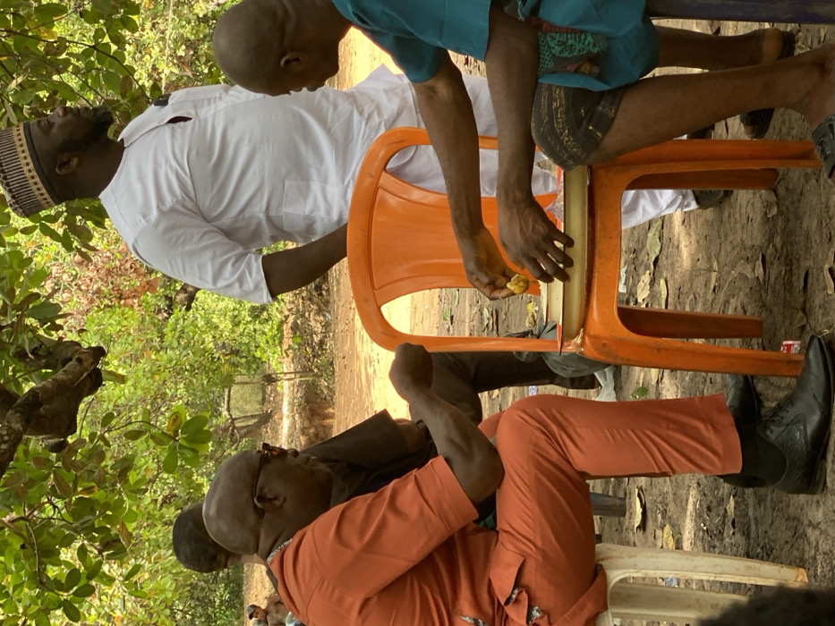 The image displays an outdoor scene in Ochadam, Nigeria, under a canopy of green trees with a visible branch in the upper left