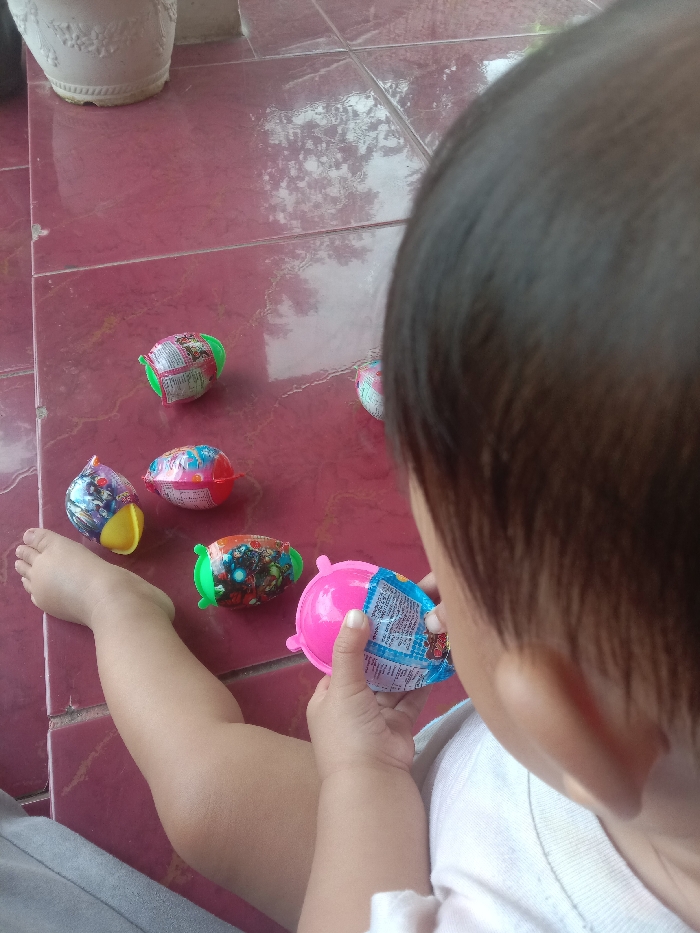 The scene depicts a young child seated on a gray surface, positioned on a red-brown tiled floor in Ciherang, Indonesia. The child, viewed from the back and right side, has dark hair and wears a light-colored top. Their bare right arm and leg are visible on the tiled surface. The child holds a pink, egg-shaped plastic container, which is partially wrapped in a label with text. Five other similar egg-shaped containers, each with colorful wrappers, are scattered on the tiled floor. One of these containers is partially open, revealing a yellow interior. A light-colored ceramic pot or planter is visible in the upper left background. Reflections of overhead foliage or sky are discernible on the glossy tiled floor.