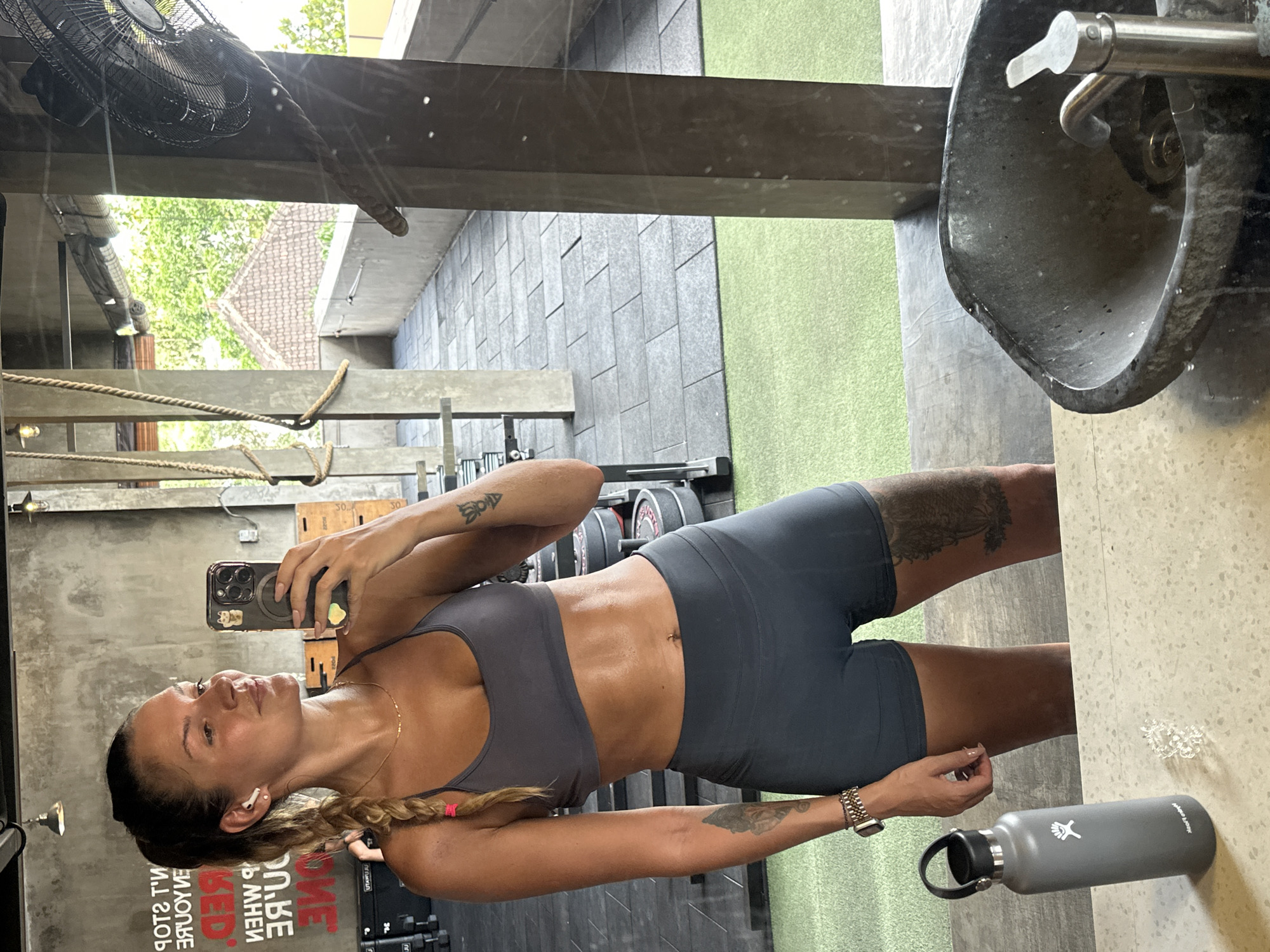 An athletic female subject is taking a mirror selfie inside a gym facility in Ungasan, Indonesia. She is depicted from the mid-thigh up, wearing a grey sports bra and matching grey cycling shorts, with her torso exhibiting visible sweat and muscular definition. Her dark blonde hair is pulled into a high ponytail with a braid, secured by a pink band. A white earbud is in her right ear, a gold chain necklace around her neck, and a small stud piercing is visible in her navel. She wears a multi-band watch and bracelets on her left wrist, and has tattoos on her left bicep and right thigh. She holds a dark-colored smartphone, equipped with a magnetic ring holder and a prominent camera array, in her right hand to capture the reflection, while her gaze is directed slightly to her right, away from the phone's lens. In the immediate foreground, on a light-colored speckled counter, a grey Hydro Flask water bottle with a black lid and handle stands upright, next to a clear, coiled hair tie. To the right, a dark, unpolished stone sink with a silver faucet is visible, its surface bearing water droplets. The background, primarily a reflection, shows an open-air gym environment. Concrete walls feature reversed red text, including phrases such as "GET TO YOUR BEST WHEN YOU'RE DONE". The floor is composed of black rubber gym tiles that transition into artificial green turf. Various gym equipment, including stacked weight plates, dumbbells, and metal racks, are partially visible. Climbing ropes hang from concrete support pillars, and industrial pendant lights illuminate the ceiling. Beyond the gym's structure, an outdoor scene unfolds, revealing additional concrete pillars, a railing, grey floor tiles, dense green trees, and a building with a traditional red-tiled roof under a bright sky. A black industrial fan is mounted high on a pillar to the far right.