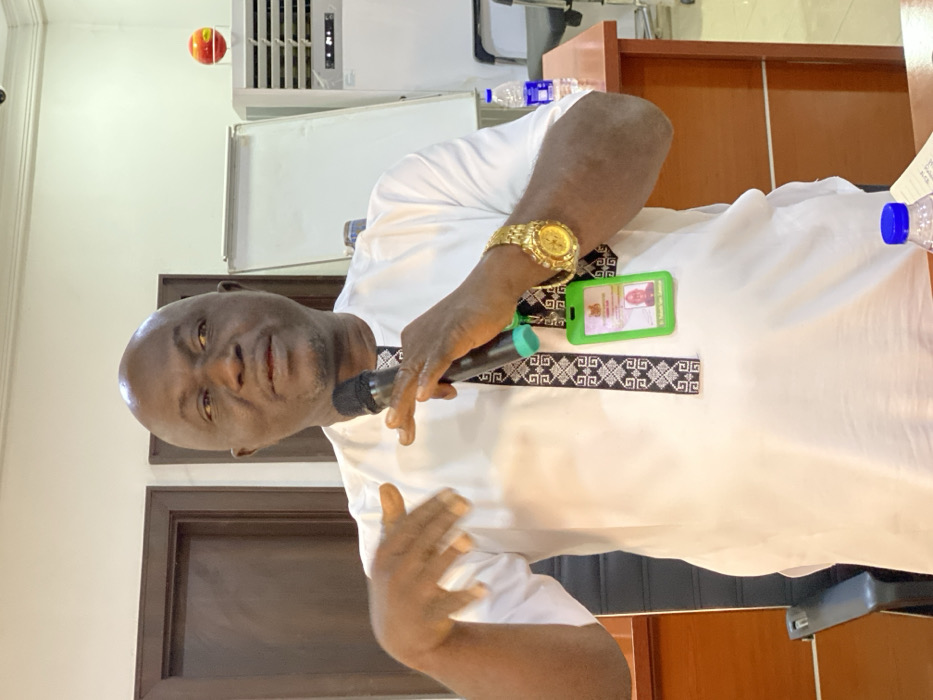 In an indoor setting within Shaba, Nigeria, a bald, dark-skinned adult male is depicted from the chest up, actively speaking into a black microphone held in his right hand. His left hand is raised, palm open, in a gesturing motion. He wears a white garment with a black and white patterned placket. A prominent gold-colored wristwatch is on his left wrist, and a green lanyard with an identification badge, displaying "Dr. Sakaatu Y. Suleiman," hangs around his neck. The background features a brown door on the left, and a white air conditioning unit on the right, topped with a red and yellow spherical object. A partial view of a whiteboard is visible behind the unit. A dark-colored security camera is mounted on the ceiling in the upper right. A wooden table with two plastic water bottles, one with a blue cap, is in the lower right, with a dark office chair partially visible in the lower left.