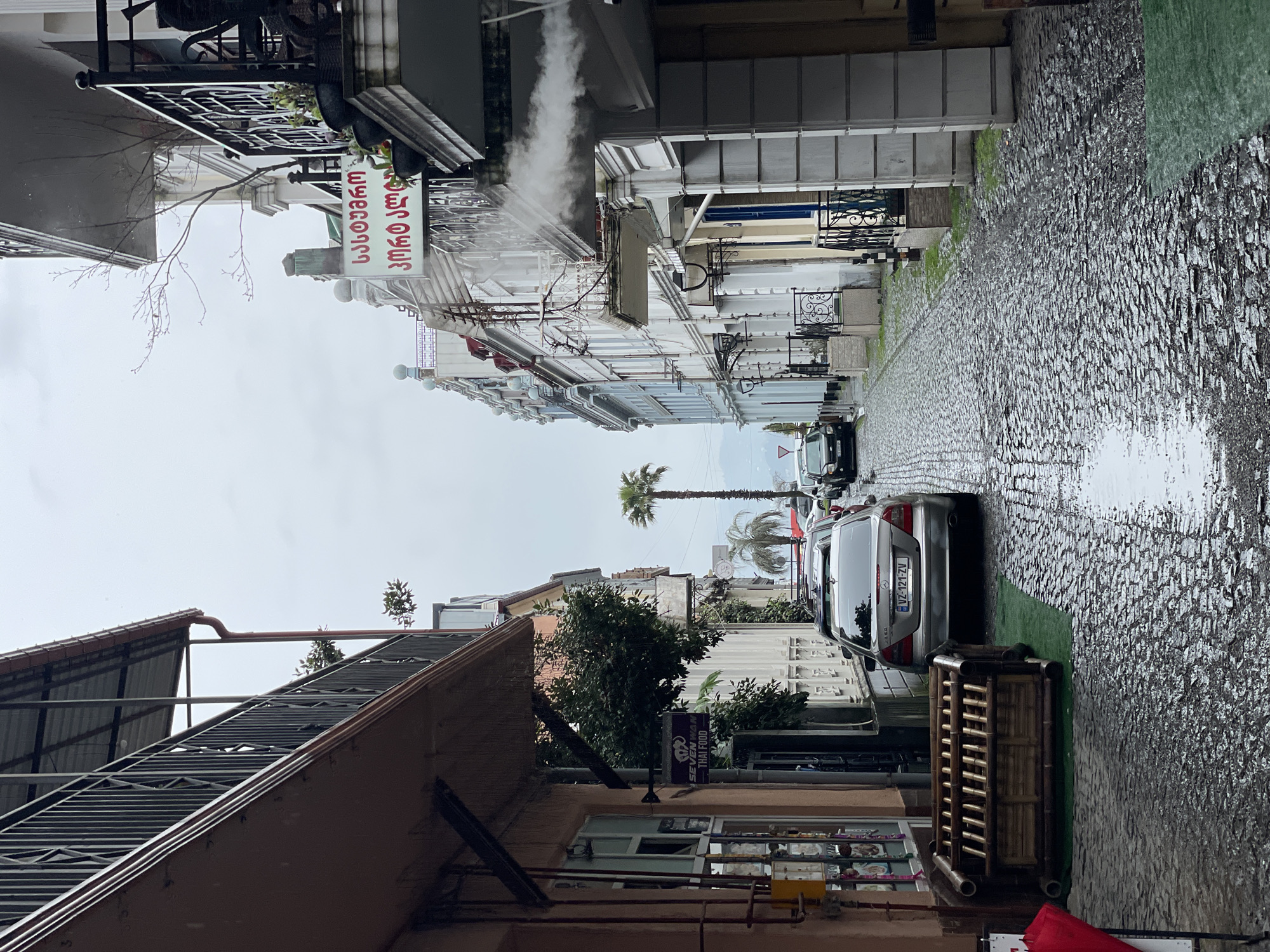 narrow street in Batumi, Georgia, on a wet day. The street is paved with cobblestones and lined with buildings on both sides. There are parked cars along the street. A palm tree is visible in the distance, and a sign in Georgian script is seen on a building. Steam is rising from one of the buildings. A sign reading "Seven War Thai Food" can be observed, as well as a bamboo furniture piece beside a parked car with license plate "NZ-121-ZV."