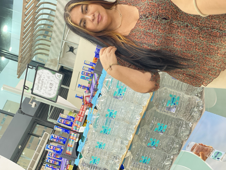 A woman stands in front of a display of water bottles, likely in a grocery store. The bottles are stacked high, with the "Nevada" brand visible. A price tag reading "AGUA MINERAL NEVADA 5 L 4,19" is displayed on a sign. The woman wears a patterned top and jewelry. Shelves of groceries are visible in the background. The scene is brightly lit.