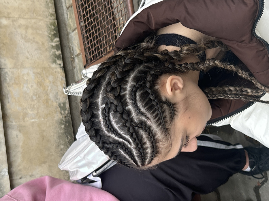 This image depicts an outdoor scene in Plovdiv, Bulgaria. The primary subject is a young individual, viewed from above and behind their right shoulder, looking downwards and to their left. Their dark brown hair is styled into numerous tight cornrows on the scalp, forming distinct wavy patterns that expose lines of skin. Multiple individual braids, exhibiting a mix of dark and lighter brown tones, extend from the scalp. The individual wears a white puffer jacket with a brown inner lining or collar, and a black neckband is visible underneath. Their left ear is uncovered. To the upper left, a second person is partially visible, wearing a pink garment on the shoulder and arm, and black pants with a white vertical stripe down the side. A black shoe is also discernible on this person. A silver-colored bag with a metallic chain strap is situated between the two individuals. The background features a weathered, light-toned wall displaying darker stains and a rusty brown metal grate to the right, likely part of a bench or outdoor fixture. The ground surface below the wall appears to be paved.