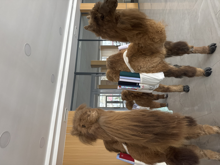 An indoor scene in Bukhara, Uzbekistan, displays multiple taxidermy or sculptural figures resembling llamas or alpacas. The figures are covered in shaggy brown fur and feature dark, hoof-like feet. At least three such figures are visible, positioned in a linear arrangement, with the largest in the foreground on the left and right, and smaller figures extending into the background. Each figure is equipped with light-colored canvas tote bags fastened to its back or sides. These bags contain several rolls of fabric, exhibiting various colors and patterns including blue, white, and green. Some bags feature graphic prints, notably an architectural motif reminiscent of a Central Asian madrasah. The immediate environment consists of a reflective, light-toned floor and a white ceiling fitted with multiple recessed circular light fixtures. Large glass panels with dark frames form the background, revealing an exterior view with trees and a building structure under a light sky. Wooden paneling is visible along the left wall. No people are visible in the scene.