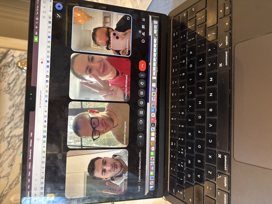 A dark-colored laptop, likely a MacBook with a UK QWERTY keyboard, displays an active Google Meet video conference, observed in the Royal Borough of Greenwich, United Kingdom. The laptop's webcam exhibits a green active light. The screen, showing some smudges, presents a Google Chrome browser window, with the URL "meet.google.com" visible. The system date "Tue 18 Nov" is displayed in the top right corner. The Google Meet conference, titled "Collective Memory x EYC...", features four participants arranged in a grid: 1. **Matteo Gaggia:** A male with short dark hair, wearing a light grey hoodie, making a peace sign with his right hand. His background is a light-colored indoor wall. 2. **Jonathan Saragossi:** A male with short hair and glasses, wearing a light-colored sweater, smiling. His background shows outdoor foliage. 3. **Charlotte Whitehead:** A female with dark hair pulled back, wearing a red top, making a peace sign with both hands. Her background is indistinct. 4. **Cora Delaney:** A female with dark hair pulled back, wearing glasses and a dark top, holding a pink smartphone, with its camera lens visible. Her background includes an ornate light fixture and a framed image of a horse. The conference time 11:49 is displayed on the bottom left of the meeting interface, which also shows controls for microphone, camera, captions, hand raise, and ending the call. The laptop is situated on a light-colored surface. A blurred indoor background, including a decorative item and a light-colored wall, is visible behind the laptop screen.