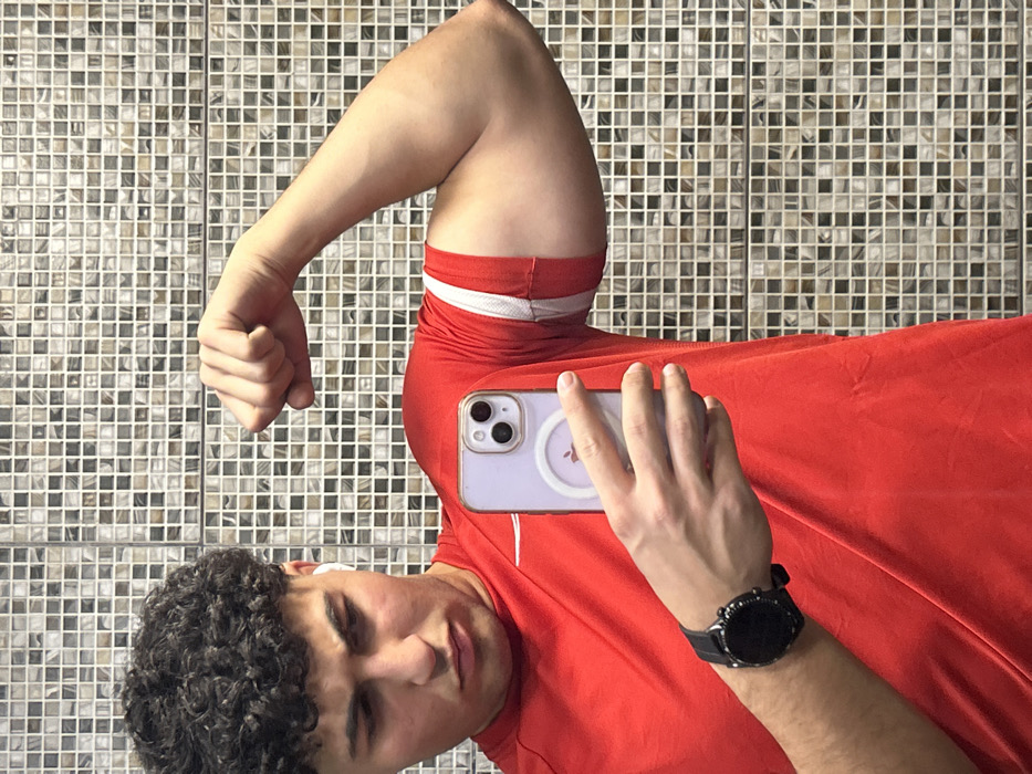 An indoor mirror selfie captures a young adult male, likely in a gym locker room or bathroom, located within Joubar Municipality, Syria. The individual has dark, curly hair and is wearing a red short-sleeved athletic shirt with a white stripe on the right sleeve. A white earbud is visible in his right ear, and a black smartwatch is on his left wrist. He holds a light purple smartphone with a clear case and a white MagSafe ring in his left hand, directing it towards his reflection. His right arm is flexed, with the bicep prominently displayed and the fist clenched. His gaze is directed downward, possibly at the phone screen or his reflection. The background features a wall covered in small, square mosaic tiles in varied shades of beige, brown, and grey.