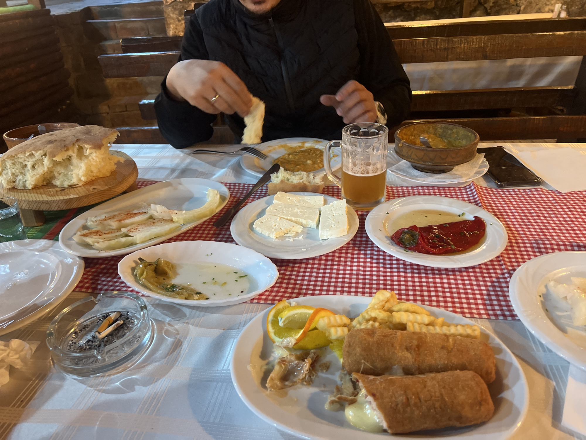 The image depicts a dining scene inside a rustic restaurant or tavern in Despotovac Municipality, Serbia. One male individual is seated at a table, visible from the chest down. He wears a dark, possibly quilted, jacket and a ring on his left ring finger. His hands are actively engaged with food, specifically tearing a piece of bread. The table is covered by a white tablecloth, with a red and white checkered runner laid over it. Numerous dishes are present: a large, partially torn loaf of rustic bread on a wooden board; a plate with rectangular slices of white cheese; plates containing baked or fried peppers (one red, one yellowish-green); a plate with a spread; a plate with light-colored, flat food items; and a main course plate featuring two large, breaded and fried rolls (one partially cut revealing a creamy filling), a portion of crinkle-cut french fries, a lemon wedge, and an orange slice. A small, ornate ceramic bowl contains a yellowish dish, possibly a bean stew. A clear glass mug filled with an amber liquid, consistent with beer, sits on the table. An ashtray containing two cigarette butts and ashes is visible. A dark-colored smartphone lies face down on the tablecloth. Additional empty white plates, silverware, and a crumpled paper napkin are also on the table. The background shows warm, dim lighting illuminating wooden benches and structural elements, including a set of wooden stairs on the left, indicative of an interior dining establishment.