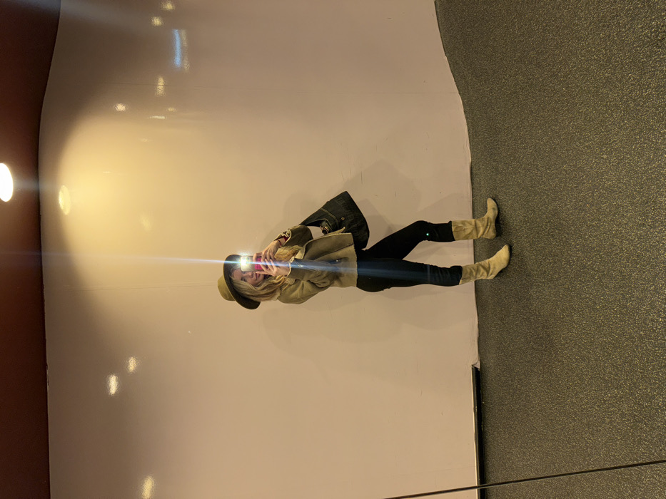 A blonde woman wearing a cowboy hat, tan jacket, black pants, and tan boots poses in front of a wall. She holds a pink phone, likely taking a picture. A dark-colored purse hangs on her shoulder. The wall is a bright, neutral color, possibly white or light beige, and features a light reflecting off its surface. The floor is gray with a textured pattern. The photo is taken indoors.