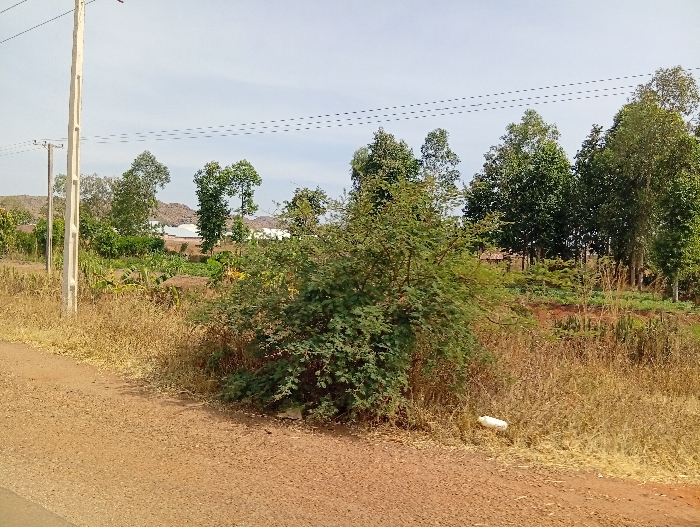 The image depicts a semi-rural landscape in the city of Unknown, Unknown, under a hazy, light blue sky. In the foreground, a reddish-brown dirt road occupies the lower left and central-bottom portion, bordered on its right by dry, yellow-brown grass and weeds. A small, white plastic object rests on the ground within this dry vegetation near the right edge of the frame. On the far left, two light-colored utility poles with overhead wires extend vertically and horizontally across the midground. A dense green bush with small leaves is centrally located in the midground, behind the dry grass. To its left, cultivated land with various green plants is visible. The background consists of a line of tall, green deciduous trees. Further in the distance, a series of white-roofed structures are discernible, with low, brown, rocky hills visible on the far left horizon. No individuals, animals, or specific actions are present in the scene.