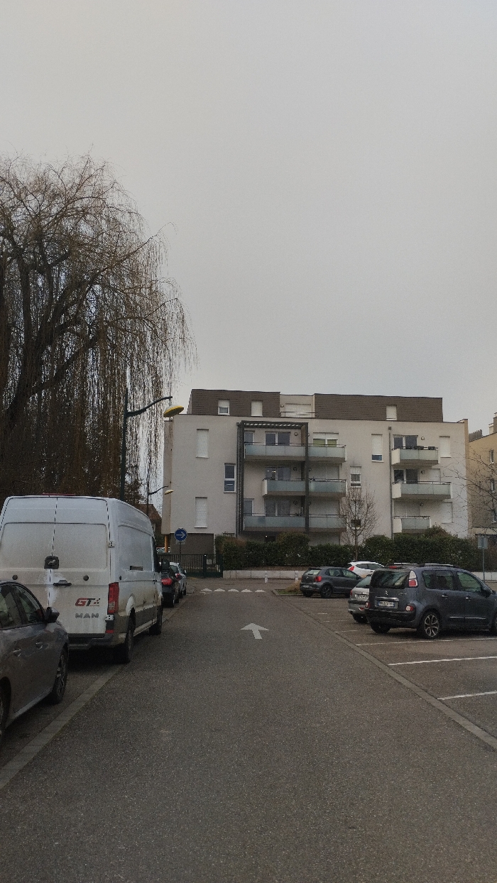 The image depicts a static street scene in Bischheim, France, under an overcast sky. In the foreground, an asphalt roadway extends from the lower center, featuring a white painted arrow pointing forward. To the left, a silver sedan is partially visible, followed by a white MAN GT.E van parked roadside, facing away from the viewer. To the right, multiple vehicles are parked in designated spaces, including a dark grey SUV with the license plate obscured, a white compact car, and a grey hatchback. In the midground, a tall, bare deciduous tree with drooping branches occupies the left side. A black lamppost with a distinct yellow, bowl-shaped fixture is visible between the tree and a multi-story residential building. Below the lamppost, a blue circular sign with a white arrow indicating a mandatory straight direction is mounted on a pole, marking an entrance to a paved area or driveway. The dominant structure in the midground and background is a modern, light-colored residential building with a brown, sloped roof. It features multiple windows with white frames and several balconies with glass railings. Hedges line the base of the building. No individuals are visible, and no dynamic actions are occurring within the frame.