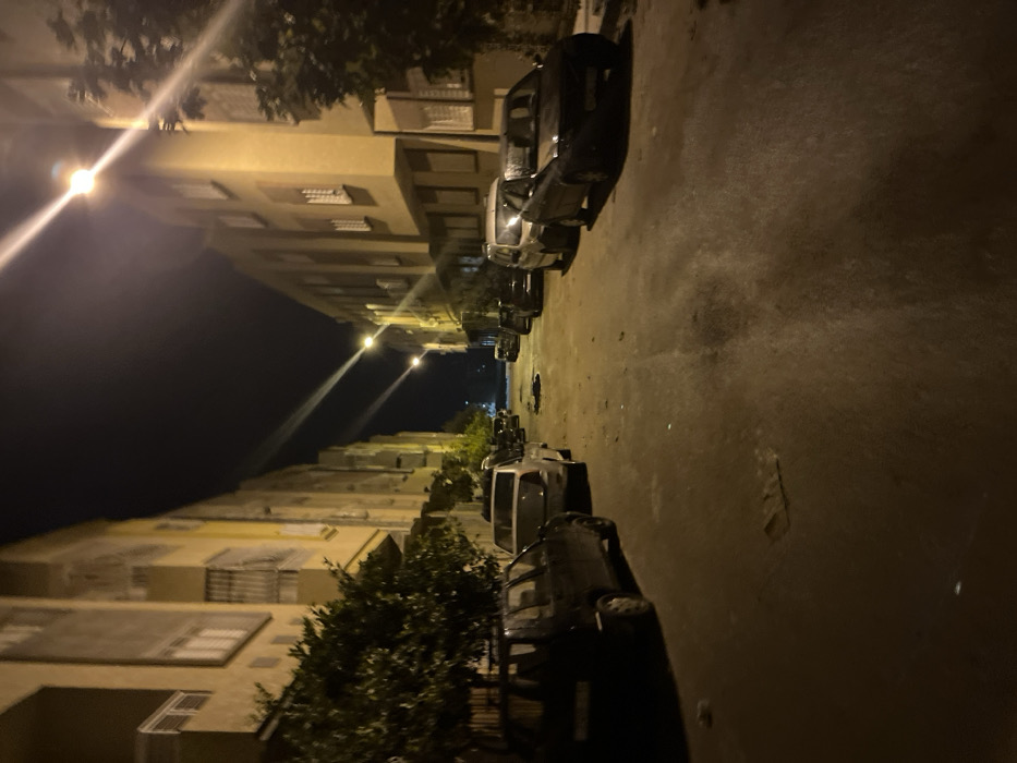 At night, a street scene features parked cars lining both sides of a road illuminated by streetlights. Buildings stand tall, flanking the street with a yellowish facade. Trees are interspersed, adding a natural element to the urban setting. The pavement is dimly lit, suggesting a quiet and possibly residential area. The overall atmosphere is calm and peaceful.