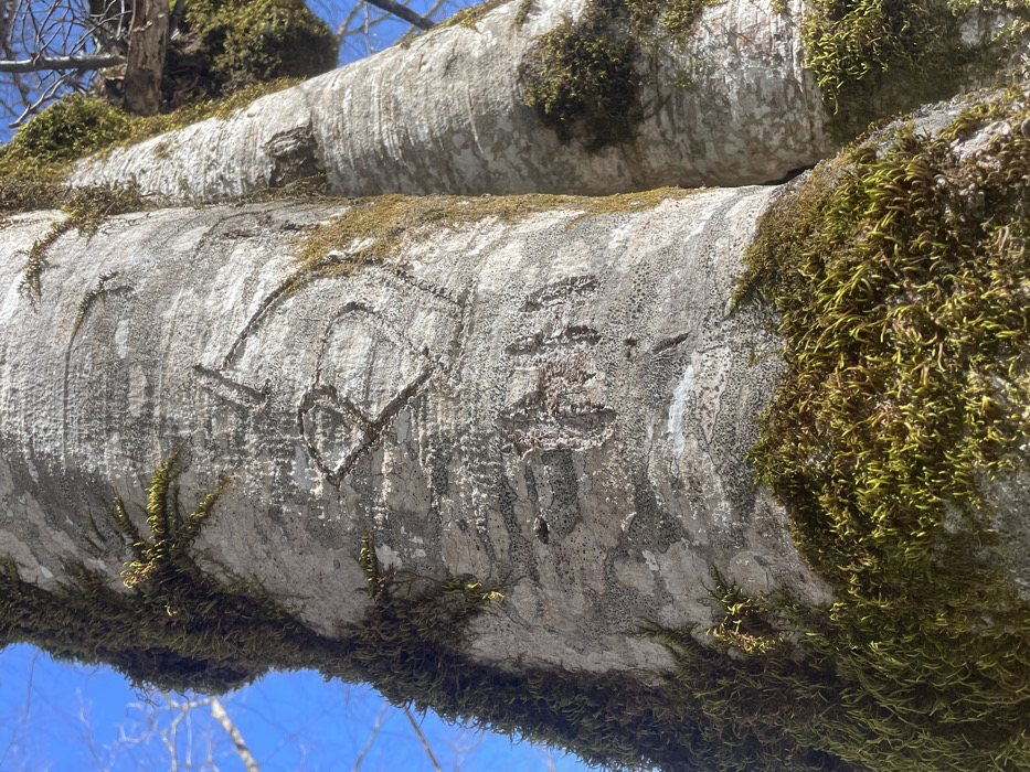 This image depicts a single tree trunk, observed from a low-angle perspective, in Pitomine, Montenegro. The trunk is characterized by light gray bark with horizontal striations and dark lichen speckles. Patches of vibrant green moss adhere to the bark, particularly along the left edge and lower sections of the visible trunk. Carved into the upper portion of the bark is a distinct heart shape, within which an 'R' or similar character is inscribed. Above the heart, a 'V' or upward-pointing arrow symbol is partially visible. Directly below the heart carving, the capital letters "HMA" are clearly incised into the bark. The background consists of a clear, light blue sky, with sparse, bare tree branches faintly visible against it, suggesting a winter or early spring setting. No individuals or active interactions are visible within the frame.