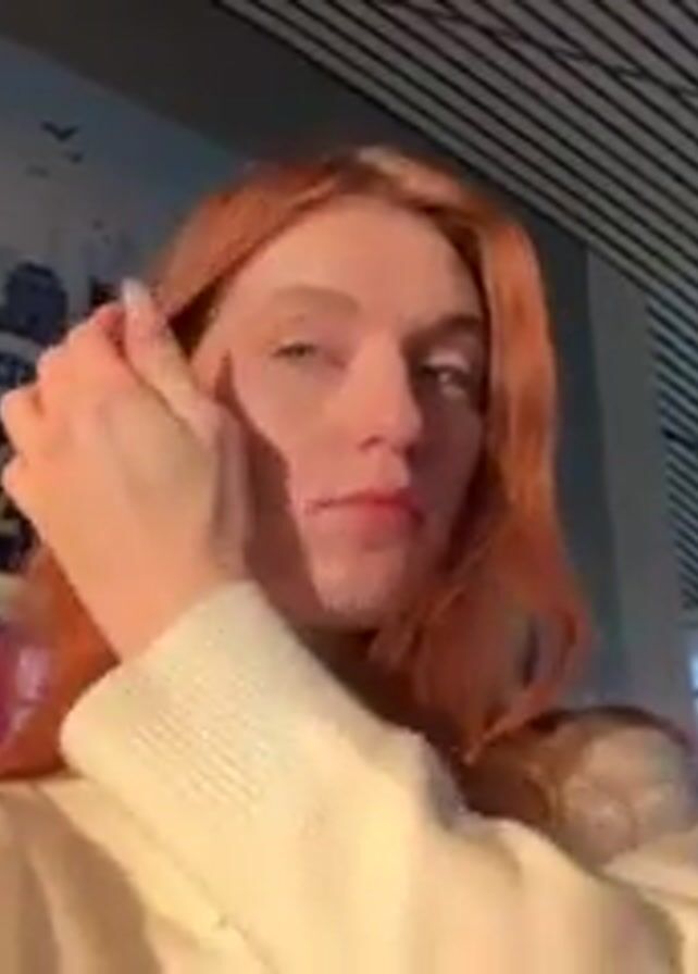 A woman with long red hair and light eyes stands indoors in front of a large sign with numbers on it. She is wearing a light-colored collared shirt. She initially gestures with her hand in front of her face and then moves her hand to her hair behind her ear. In the background, there is a partially visible woman and a ceiling with dark lines. The lighting is bright, seemingly from sunlight.