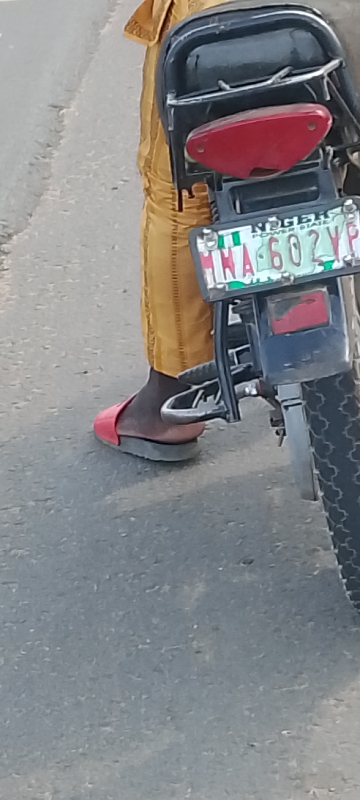 The image captures a close-up, low-angle view of the lower body of a person and the rear of a motorcycle, positioned on an asphalt road surface. The person wears loose-fitting, mustard yellow trousers with vertical patterned stitching and a single red slide sandal with a dark grey sole on their visible right foot. The foot exhibits a dark skin tone. The motorcycle's rear assembly is black, featuring a prominent red taillight. Below the taillight, a Nigerian license plate is clearly visible, displaying "NIGER POWER STATE" at the top and the alphanumeric sequence "HNA 602 YF". A black tire with a distinct block-style tread pattern is partially visible on the right, along with a silver-colored footpeg/kickstand mechanism. The environment consists solely of the grey asphalt road, textured with minor debris. The location, as indicated by the motorcycle's license plate, is Niger State, Nigeria. There are no specific visual elements within the image that corroborate a precise location within the city of Lokoja, Nigeria.