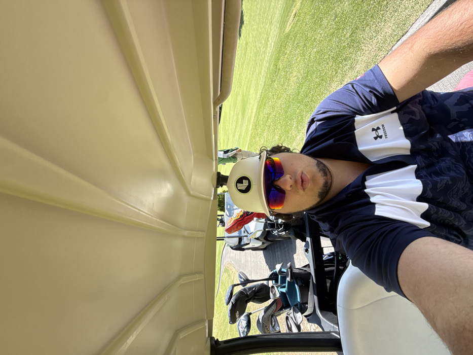 The image captures a male individual taking a selfie from within a golf cart on a golf course in Interlomas, Mexico