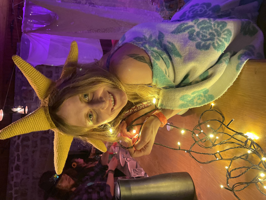 A woman with a smiling face wears a sun hat and holds a string of lights. She is wrapped in a blanket with a floral pattern. In the background, there is a glimpse of other people and decorations. The lighting is a mix of warm and purple tones. The photo appears to be taken indoors, possibly at a festive gathering.