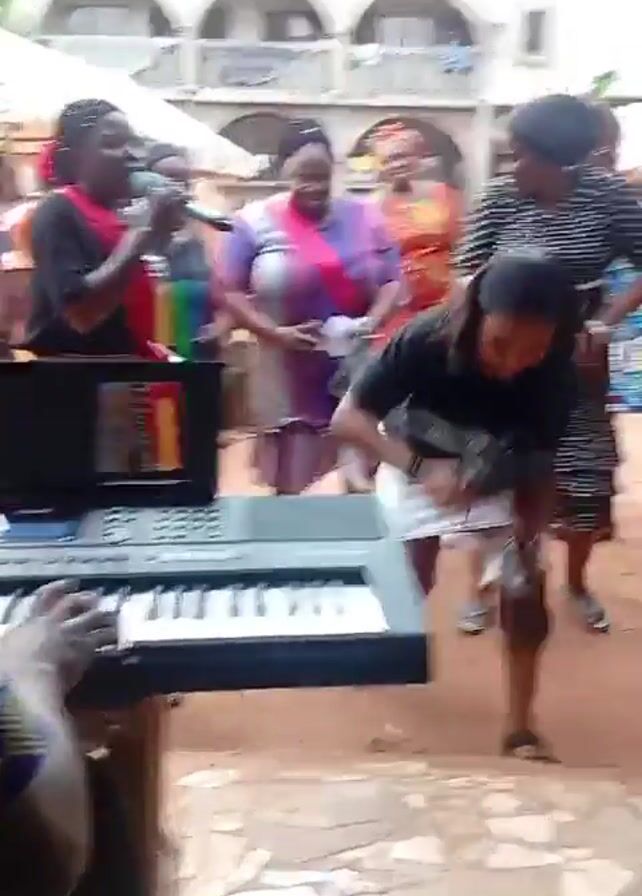 A group of women dance in front of a keyboard player and singer. The keyboard player is partially visible behind the keyboard, with a laptop on top displaying what appears to be sheet music. A woman sings into a microphone. About eight other women are dancing on a brick-paved area in front of a two-story building with a veranda. One woman in a black shirt and white skirt dances with her purse on the ground in front of her. Other women are dressed in brightly colored patterned dresses. They appear to be enjoying themselves. The scene is outdoors, possibly in a courtyard or public space.