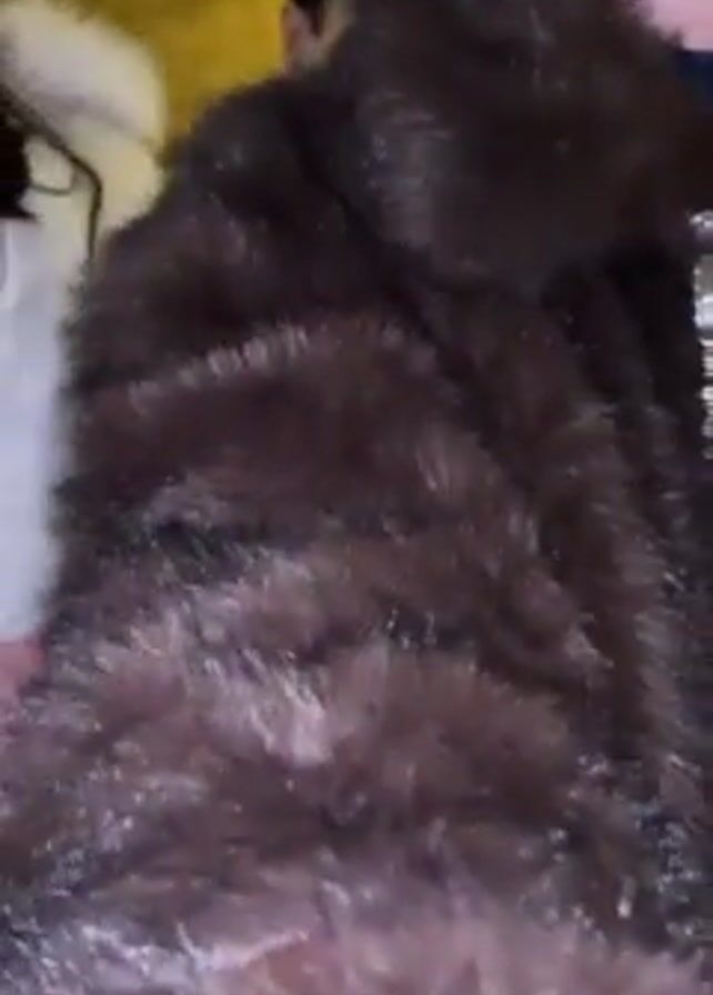 A woman in a brown fur coat poses for a camera, sticking out her tongue and making a peace sign