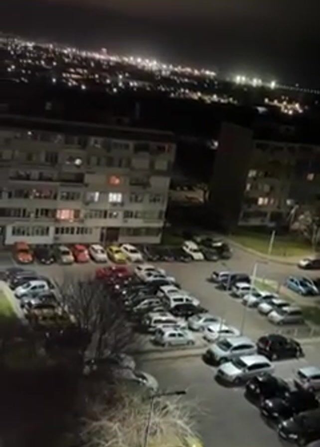 n aerial shot of a densely populated urban area at night. The scene is dominated by rows of apartment buildings and a large parking lot filled with numerous cars. The city lights illuminate the horizon, creating a hazy glow against the dark sky. There is a sense of stillness and quietness in the scene, with no visible movement or people.