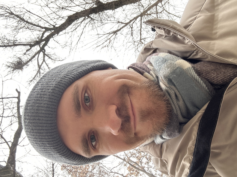 A selfie shows a man wearing a gray beanie, a light-colored jacket, and a patterned scarf. He has blue eyes, fair skin, and a beard. He is looking directly at the camera with a slight smile. Behind him is a wintery scene with bare tree branches and a bright sky. The photo is taken from a low angle, looking up at the man. A bird's nest can be seen in the tree branches.