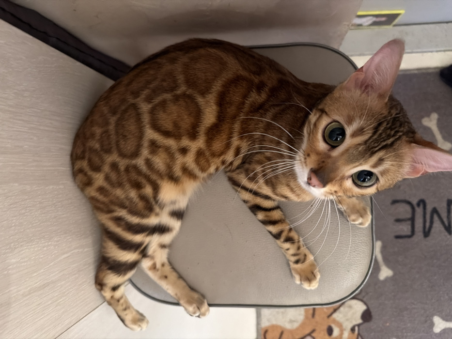 The image depicts an indoor scene, likely a residential interior, located in Novoe Devyatkino, Russia. The primary subject is a Bengal cat, characterized by its distinctive short, patterned coat displaying rosettes and stripes in shades of brown, tan, and black. The cat is positioned on its back, curving its body, with its head tilted upwards, looking directly towards the viewer. Its large, round eyes, appearing green or yellow, are wide open with dilated pupils. Long, white whiskers extend prominently from its muzzle. The cat's four legs are partially extended. It rests on a light grey or beige padded surface, consistent with a chair seat or bench, which has a visible darker trim along its edge. To the upper left of the cat, a light-colored wooden or laminate surface is visible. To the lower left, a dark grey floor mat or rug with white bone patterns and partial lettering, specifically "ME," is visible. A blurred, brown and white shape is also present on the mat. The scene is well-lit.