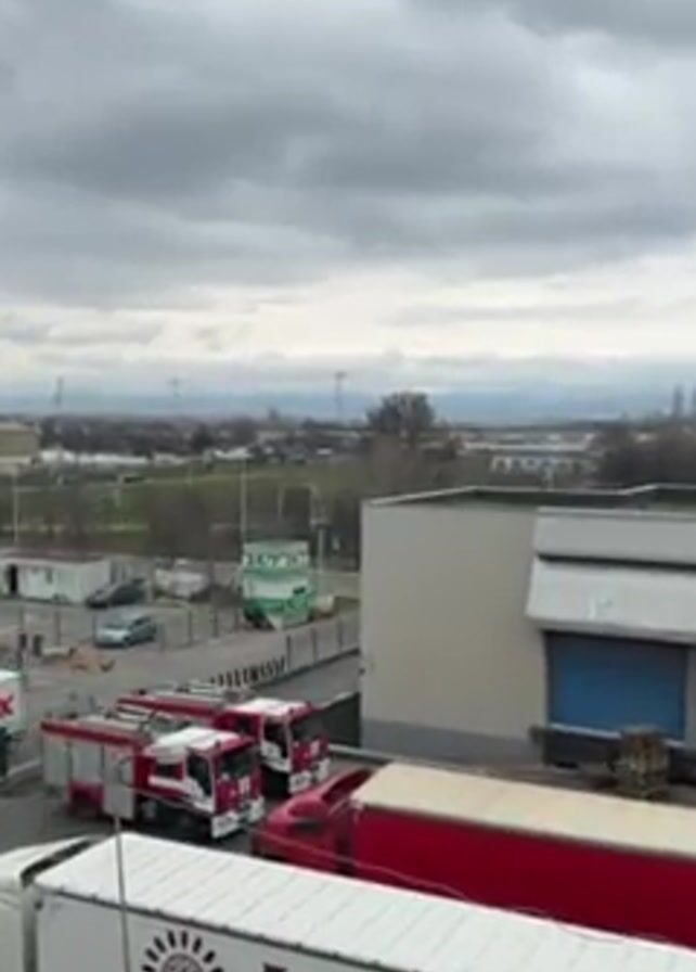 n airfield scene on an overcast day. Initially, the shot focuses on a parking area with several vehicles, including a FedEx van, fire trucks, and a Hitit Global Lojistik truck. The camera then pans upwards and across to reveal the airfield. The focus shifts to an aircraft, specifically a large gray plane sitting on the tarmac. Mountains are visible in the distance under the cloudy sky.