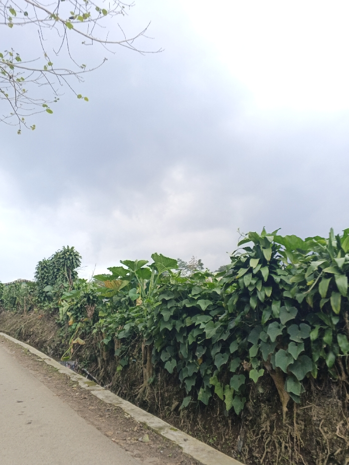 The image displays a roadside environment in Siexiengmai, Laos, under a uniformly overcast sky. A grey-beige paved road or path occupies the lower-left, bordered on its right by a concrete curb. Immediately adjacent to the curb is a dirt embankment, densely covered with various green plant species. This vegetation includes large, broad-leafed plants prominently in the center-right, and smaller, darker green foliage. Exposed roots are visible along the base of the embankment where it meets the curb. In the upper-left corner, bare tree branches with sparse, small light green leaves extend into the frame. Additional green foliage and trees are visible in the background, appearing less distinct. No individuals, animals, or specific actions are depicted.