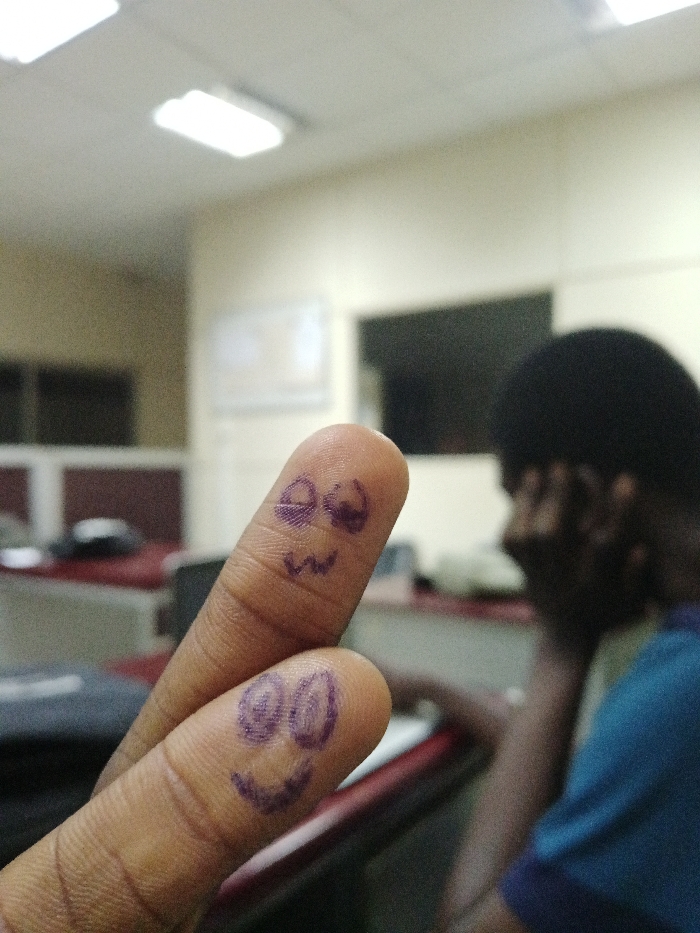 The image portrays an indoor setting in Kakuri Gwari, Nigeria. In the immediate foreground, two human fingers with light brown skin are presented vertically. The upper finger displays a face drawn in purple marker, characterized by two horizontal oval shapes for closed eyes and an inverted 'w' shape for a mouth. The lower finger similarly features a face drawn in purple marker, with two circular shapes for eyes and an upward-curving line representing a smile. The background is significantly out of focus, revealing a seated individual on the right side of the frame, visible from the shoulder up. This person has dark hair, wears a blue shirt, and has their right hand positioned near their face. The environment appears to be an office or classroom, with a white ceiling featuring multiple rectangular fluorescent light fixtures, light-colored walls, and indistinct office furniture, including desks with maroon-colored partitions.