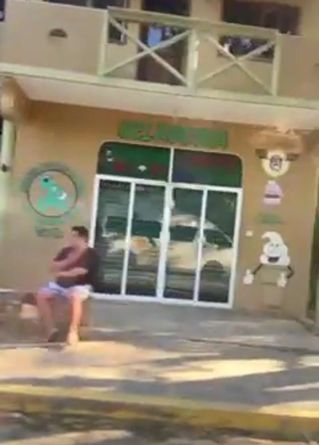 The camera, possibly mounted on a moving vehicle, captures a daytime street scene in a warm climate. A two-story building with a tan facade dominates the left side of the frame. The building appears to house multiple storefronts, each with glass doors and windows. One storefront is adorned with cartoonish graphics. Two men are visible near the building: one is walking and the other is seated on a bench. The street, demarcated by a yellow curb, is partially visible in the foreground. Trees with green foliage line the street. The sky is bright with sunlight.