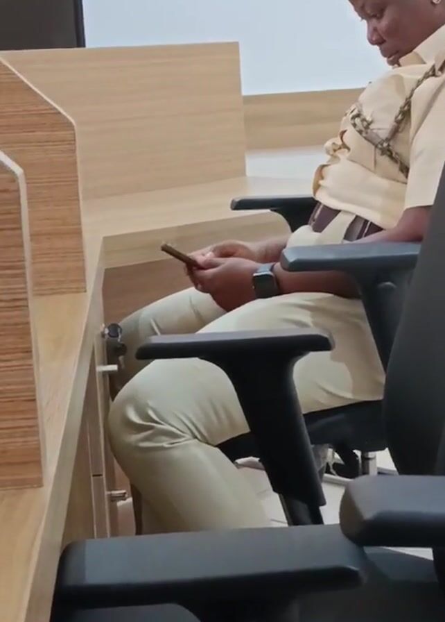 A medium shot shows a woman in a tan uniform sitting in an office chair, looking at a cell phone in her hands