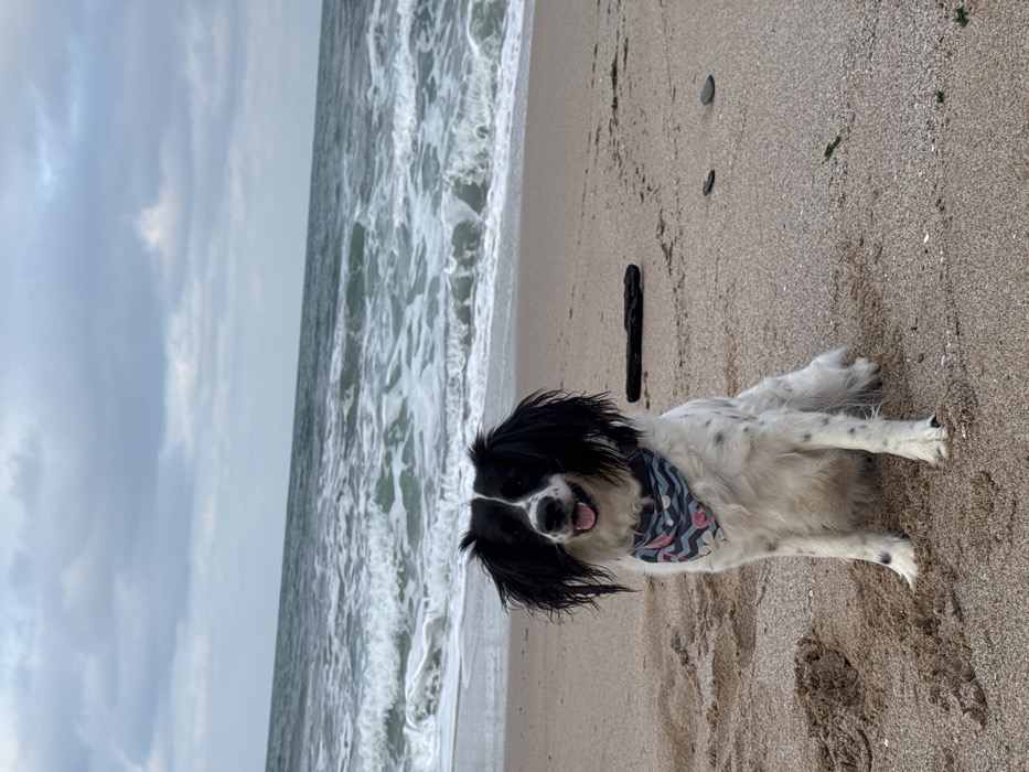 - "The image displays a black and white dog seated on a sandy beach in Tsarevo, Bulgaria" by FM-LVnhY2, licensed under CC BY 4.0