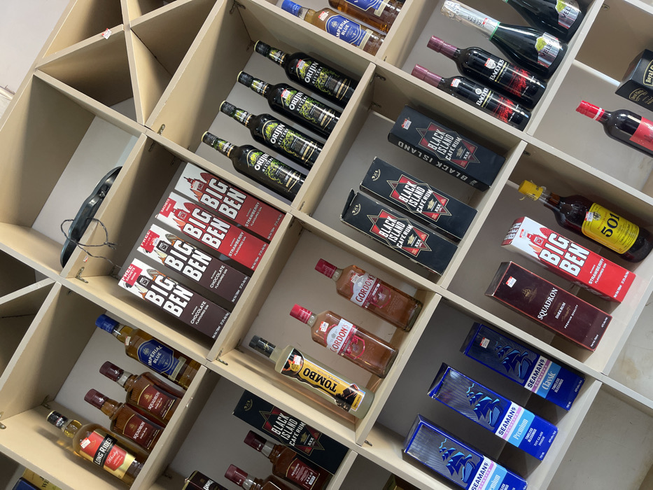 The image depicts a retail display of alcoholic beverages within a store located in Lugbe, Nigeria