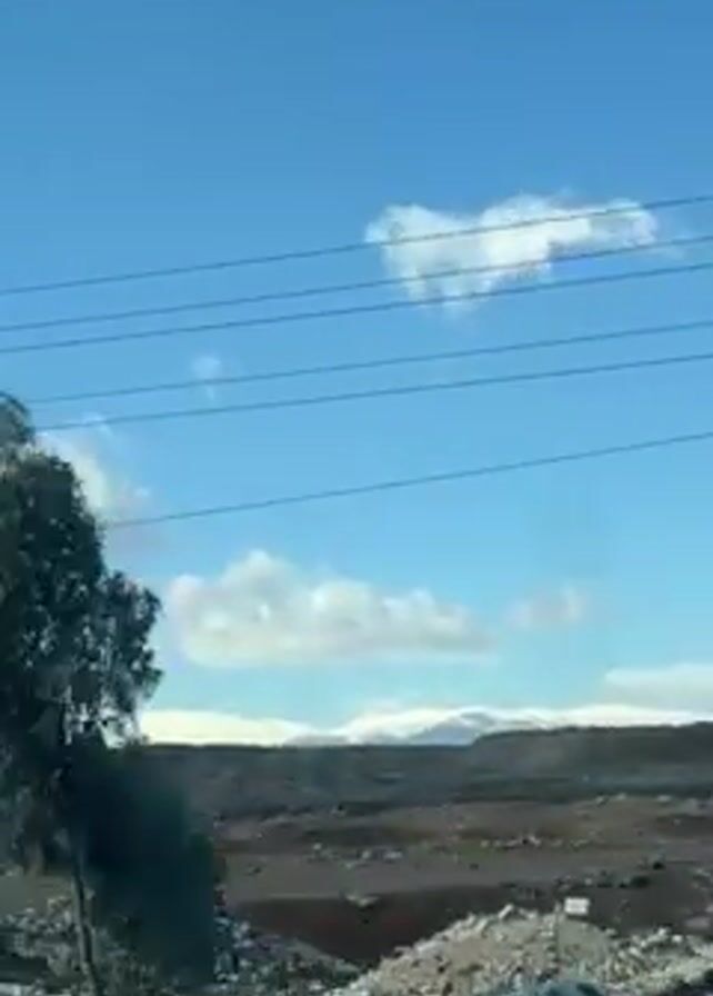 landscape taken from a moving vehicle. The sky is blue with scattered white clouds. In the foreground, there is a metal utility pole with power lines stretching across the frame. The ground is rocky and barren, with patches of debris and sparse vegetation. In the distance, there are snow-capped mountains visible on the horizon. The camera pans upwards, emphasizing the sky and the power lines. The overall impression is a rural or industrial landscape on a sunny day.