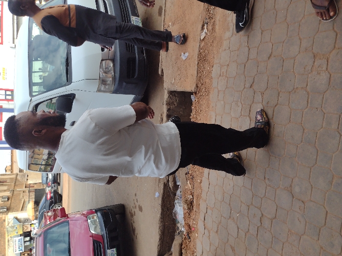 A medium shot depicts a street scene with a man in a white shirt and black pants facing away from the camera. He stands on a tiled pavement. A white van is parked behind him, and a red car is partially visible in the foreground. Other people are present in the scene, though their faces are not clearly visible. The setting appears to be a commercial area with buildings visible in the background.