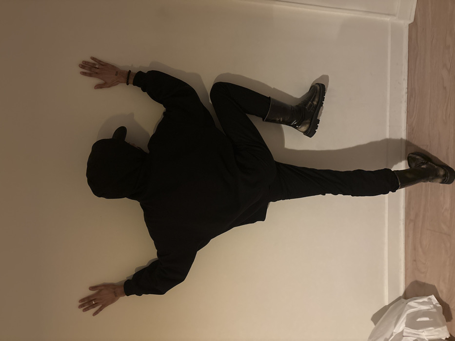 A person dressed in all black, including a hooded sweatshirt and boots, is pressed against a white wall. One leg is bent at the knee, while the other extends straight toward the right. The person's hands are flat against the wall on either side of their head. The wall meets a wooden floor in the lower right corner. A white object lies on the floor near the wall.