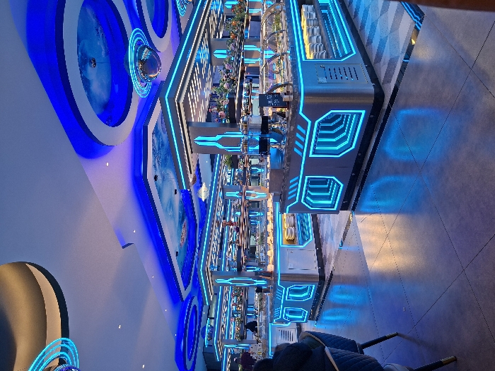 A futuristic-themed restaurant features a long buffet line with food under glass displays. Blue LED lighting outlines the buffet structure and ceiling designs. Decorative, illuminated planet-like objects adorn the ceiling. The flooring has a geometric pattern reflecting the blue light. Modern chairs are visible at tables near the buffet.