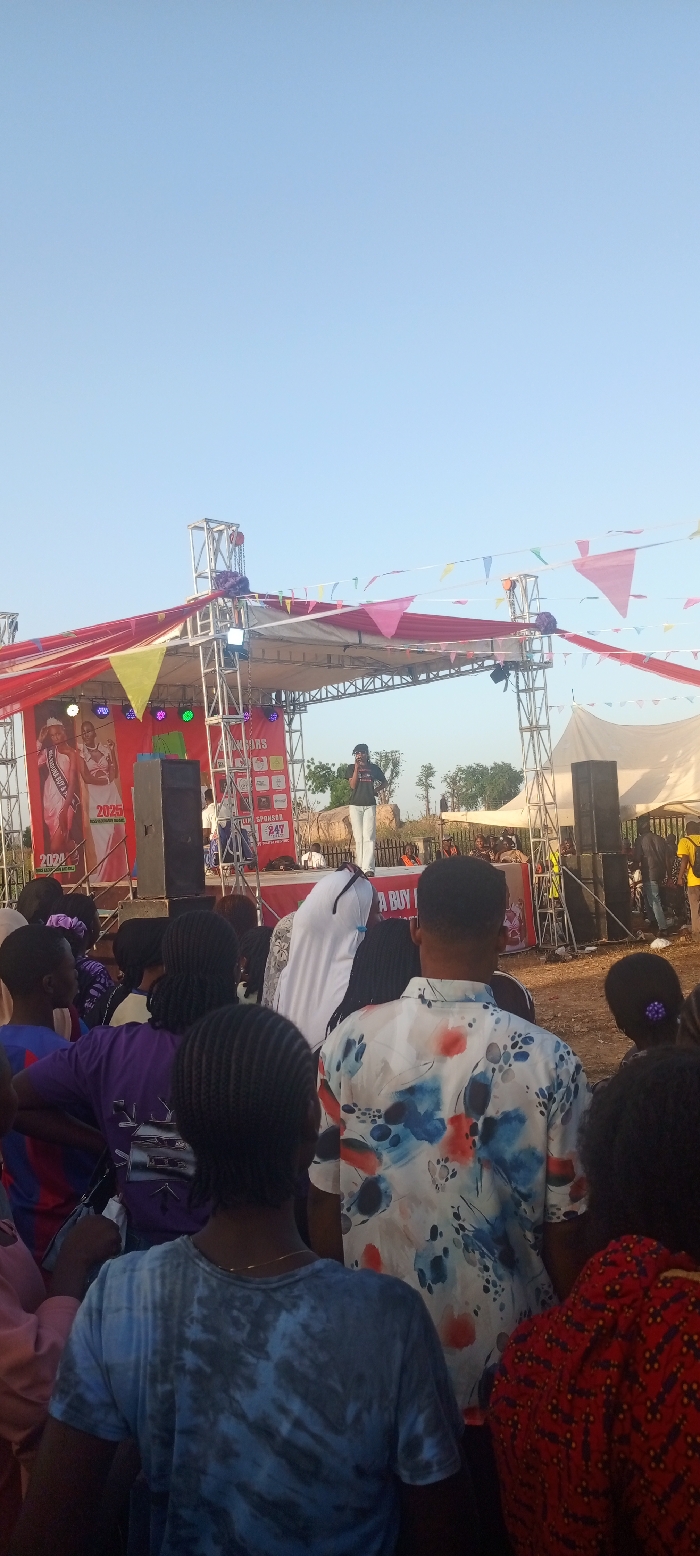 The image depicts an outdoor public event taking place in Rido, Nigeria, under a clear, light blue sky. A temporary stage, constructed from silver metal trussing, stands centrally. The stage is covered by a white canopy adorned with red fabric draping and colorful triangular pennant banners. A large red banner serves as the stage backdrop, featuring a white overlay with images of a woman and a man, both displaying "2025" and "KADUNA BOY & GIRL" text. A "SPONSORS" section with various logos, including "247" and "94.7," is also visible on the red banner. Two prominent dark speaker units are positioned on either side of the stage's front. A person wearing light-colored pants and a dark top stands center-stage, holding a microphone and addressing a crowd. Other individuals are present on the stage. The foreground is dominated by a dense gathering of people, mostly viewed from behind, standing on a dirt surface and facing the stage. Visible clothing in the crowd includes a light blue and dark tie-dye t-shirt, a white, blue, and orange patterned shirt, a red patterned shirt, a purple shirt, and a person wearing a white head covering. In the background, sparse trees and large rock formations or hills are visible under the clear sky, along with another white tent on the far right.