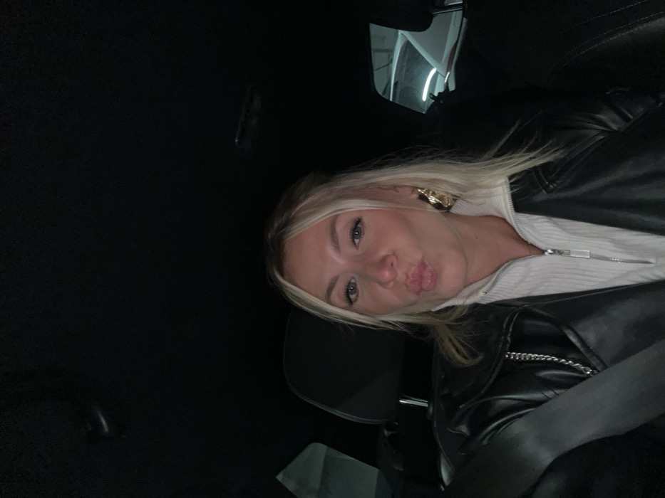 A fair-skinned blonde woman with blue eyes pouts toward the camera. She wears large gold earrings, a white ribbed sweater with a zipper, and a black leather jacket. The image is taken inside a car, likely at night. Dark tones dominate, with a hint of light coming from a window. The woman leans slightly toward the right side of the frame.