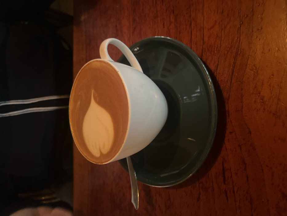 - "A white ceramic cup filled with latte, featuring a distinct white leaf-shaped latte art design, sits centered on a dark green ceramic saucer" by FM-fZXFa2, licensed under CC BY 4.0