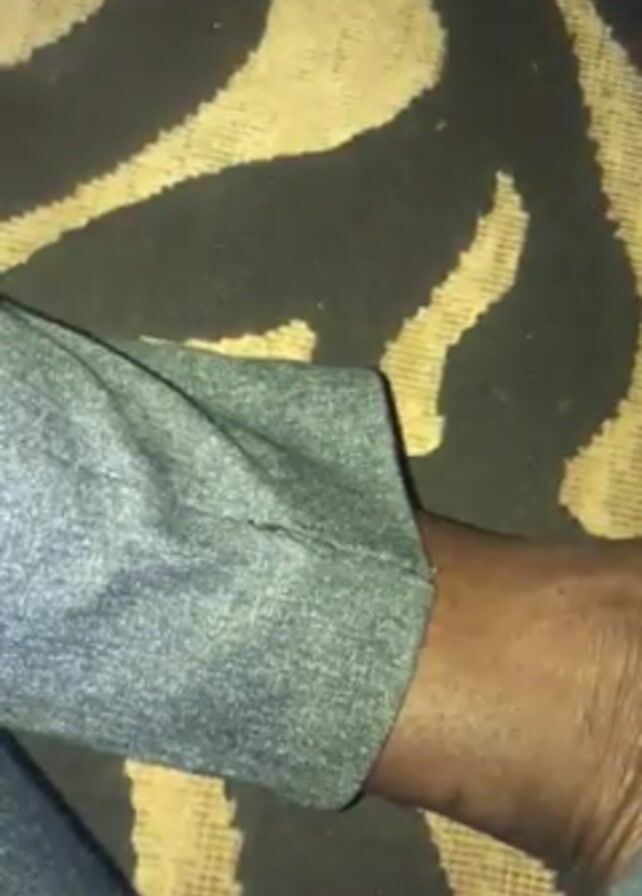 A close-up shot shows a person's lower leg and ankle wearing grey trousers. The person's skin is dark. The background is a brown and tan patterned rug. No other details can be determined.