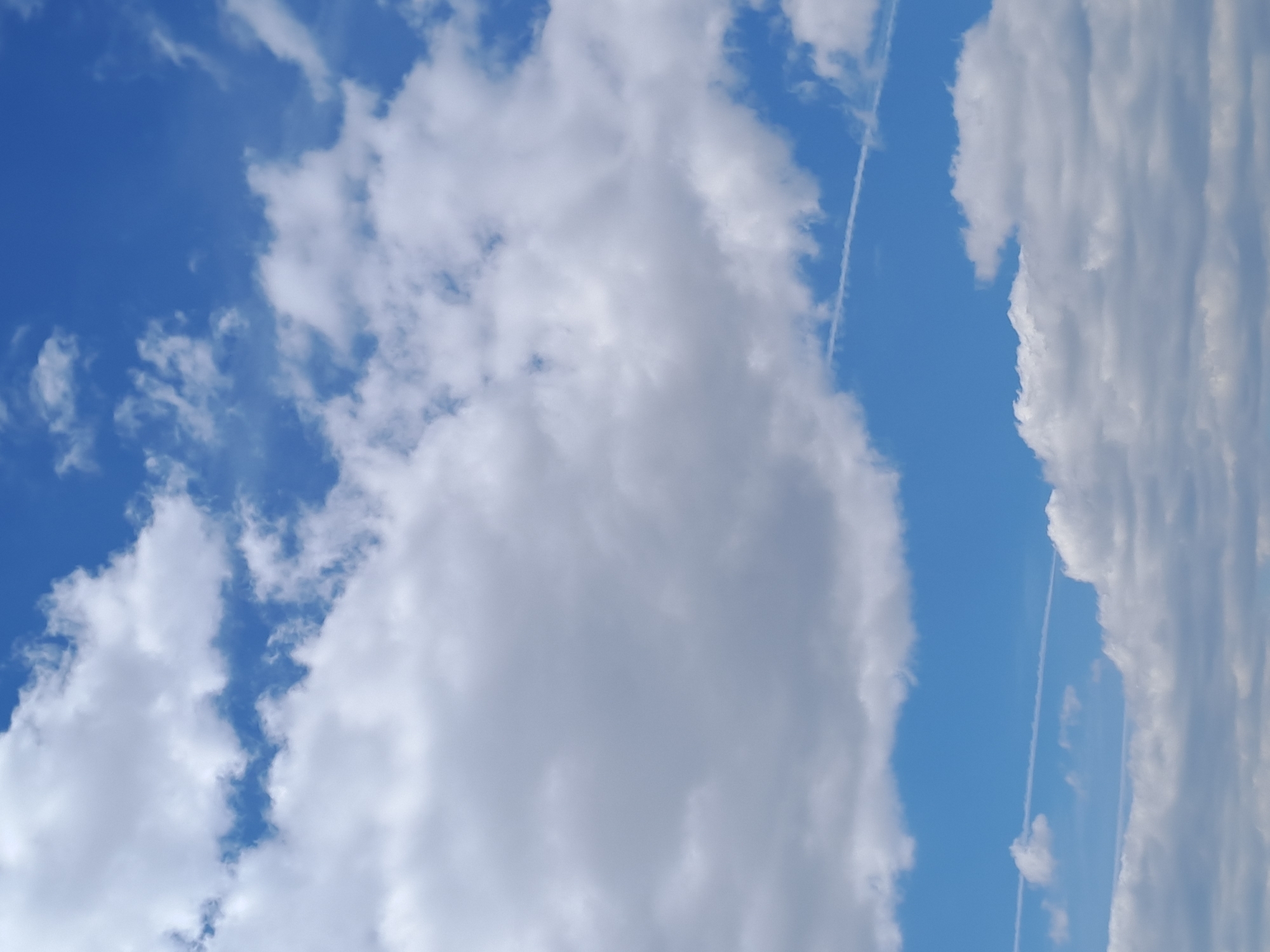 The image depicts an expansive view of a partly cloudy sky over Slivnitsa, Bulgaria. The sky is predominantly bright blue, visible in various patches between and around cloud formations. Numerous white and light grey cumulus clouds of varying sizes are present, scattered across the frame, occupying a significant portion of the visual field. Some larger cloud masses appear denser and more uniform in tone. Two distinct, linear white contrails are observed; one runs diagonally from the upper right quadrant towards the lower left, and another, less prominent, extends horizontally across the lower middle section of the image. No people, man-made structures, or ground features are visible. The scene is static, devoid of discernible actions or interactions, and represents an environmental view of the atmosphere.