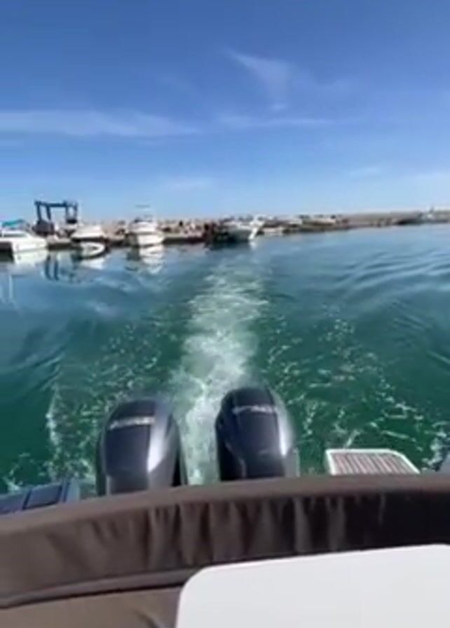 The camera is on the back of a boat, looking back at the wake. The boat is leaving a marina. On the stern of the boat are two dark gray Yamaha outboard motors. There is a white table in the foreground. The water is relatively calm and turquoise green. A few other boats are visible in the marina, along with a crane. The sky is blue with light clouds.
