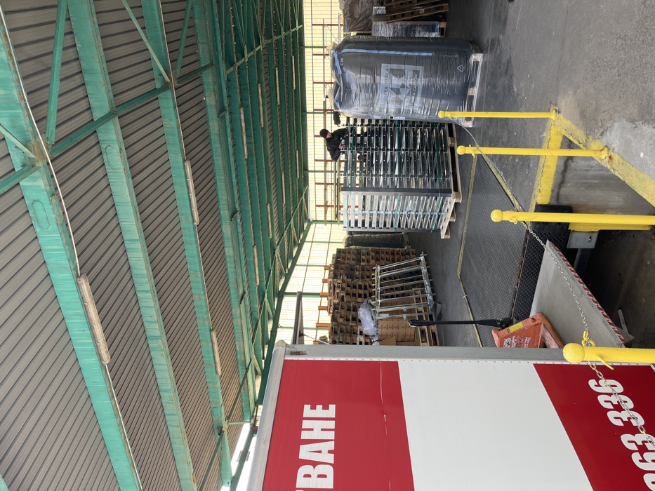 The scene depicts an interior view of an industrial loading dock or warehouse in Novi Iskar, Bulgaria. A red and white commercial truck or trailer is partially visible on the left, backed up to a loading bay. White lettering "BAHE" and numbers "263 336" are visible on the truck's side. An orange manual pallet jack rests on the truck's lowered hydraulic liftgate, which connects to the concrete ground. Yellow bollards connected by a chain mark the edge of the loading dock. The overhead structure consists of a grey corrugated metal roof supported by green-painted metal beams, with several fluorescent tube lights affixed to them. The background features extensive stacks of wooden pallets along a rear wall, which incorporates translucent panels allowing daylight. In the mid-ground, to the right, a large stack of flat, rectangular items, possibly glass or metal panels, is visible on a wooden pallet. Adjacent to this, a large black plastic-wrapped palletized object, possibly a bulk bag, displays text including "DOYA H121 A" and "NARA CASTOR". One individual, wearing dark clothing and a dark beanie, is observed standing atop the stack of rectangular panels, engaged in an unidentifiable action.