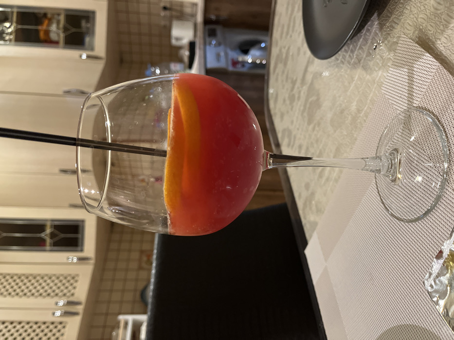 - "A stemmed glass, containing a reddish-pink beverage garnished with two orange slices and a black straw, is positioned centrally on a patterned table" by FM-KniOR2, licensed under CC BY 4.0