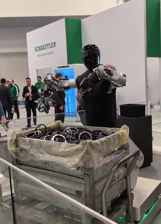 black robot with silver arms performing an industrial task. The robot is standing behind a metal container filled with numerous metal rings covered by a clear plastic sheet. The robot appears to be picking up items from the container and moving them. Behind the robot is a display stand with the word "SCHAEFFLER" and the tagline "We pioneer motion." People are walking in the background, some observing the robot. The setting is a convention or exhibition hall, with bright lighting and a clean, modern aesthetic. There is a sign at the bottom that reads "READ MORE ABOUT HUMANOID ROBOTICS" with a QR code.