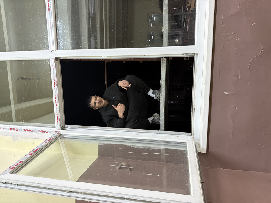 A young adult male, identified as being in Panagyurishte, Bulgaria, is depicted squatting within the lower section of a multi-pane white PVC window frame