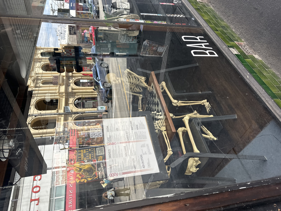 The image displays the interior of a bar, viewed through a large street-level window, located in Fitzroy, Australia. Inside, two full-body anatomical skeletons are seated on black chairs at a square wooden table, positioned as if playing a game of chess. The skeleton on the right, facing left, has its right hand poised over a white chess piece on the chessboard. A second skeleton is seated opposite, with its left arm extended towards the board. A white printed menu sheet is affixed to the inside of the window, partially obscuring the skeletal figures, listing categories such as "TO SHARE," "HANDHELDS," and "CLASSIC COCKTAILS." The word "BAR" in white sans-serif lettering is applied to the lower right portion of the window glass. The interior floor is dark wood, and the exterior base of the building below the window features green rectangular tiles. Reflections on the window reveal a street scene with pedestrian and vehicular traffic. Across the street, a prominent, multi-story building with ornate, light-colored facades, arched windows, and balconies is visible. To its left, a red-fronted building with a partial "Coles Store" sign is reflected. Two pedestrians are visible on the opposite sidewalk, and a dark blue SUV is parked in the street, along with other vehicles. Traffic lights are also reflected centrally.