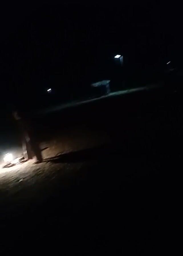 dark scene with a light source illuminating a small area. A person can be seen briefly standing near the light source. The environment appears to be an open space or field at night. The light source seems to be placed on the ground. The person is silhouetted against the darkness.
